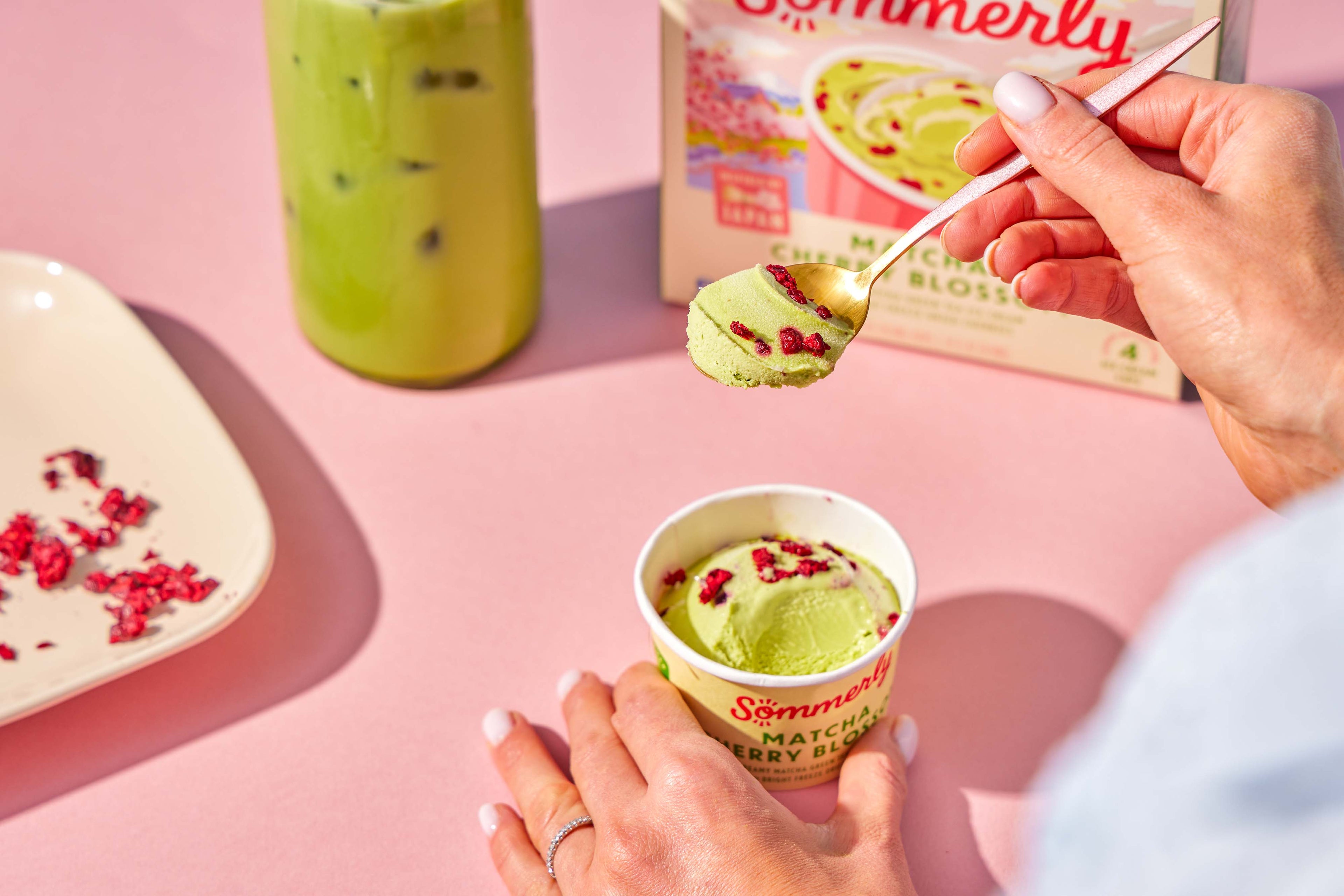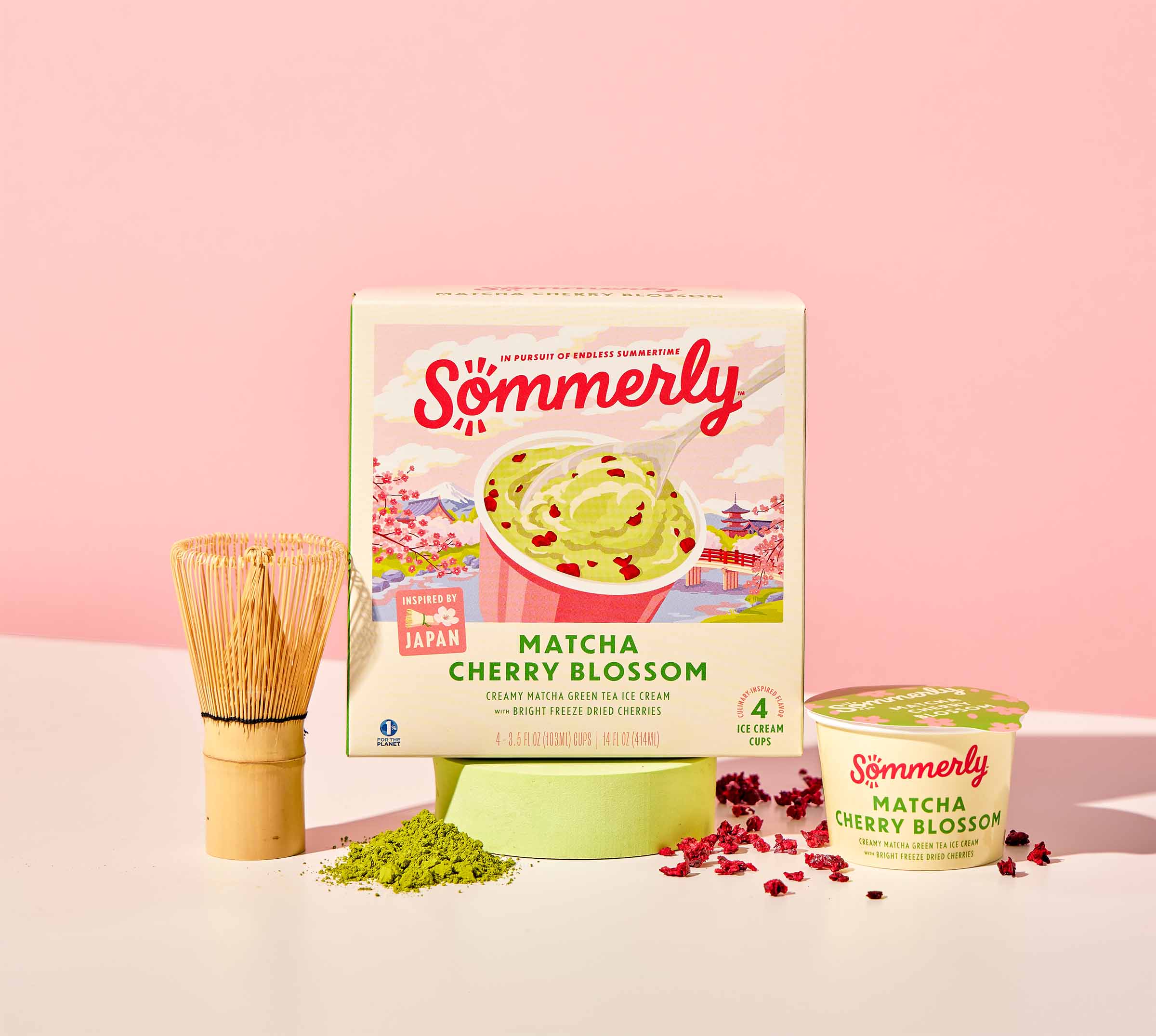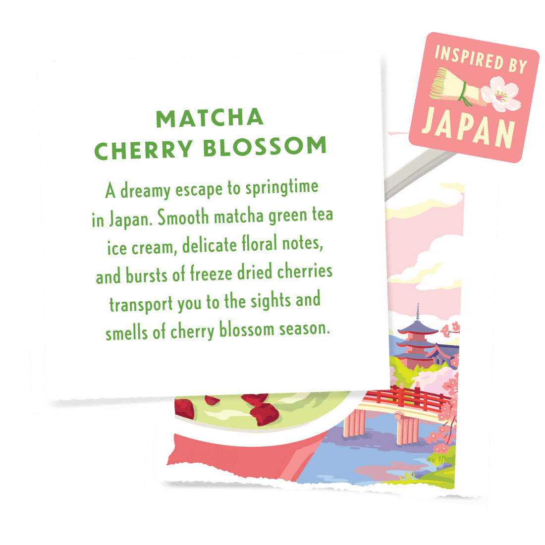 Inspired by springtime in Japan, this flavor captures the essence of cherry blossom season. Smooth matcha ice cream with hints of rose and jasmine, topped with freeze-dried cherries. Bright, floral, and made for dreaming.
